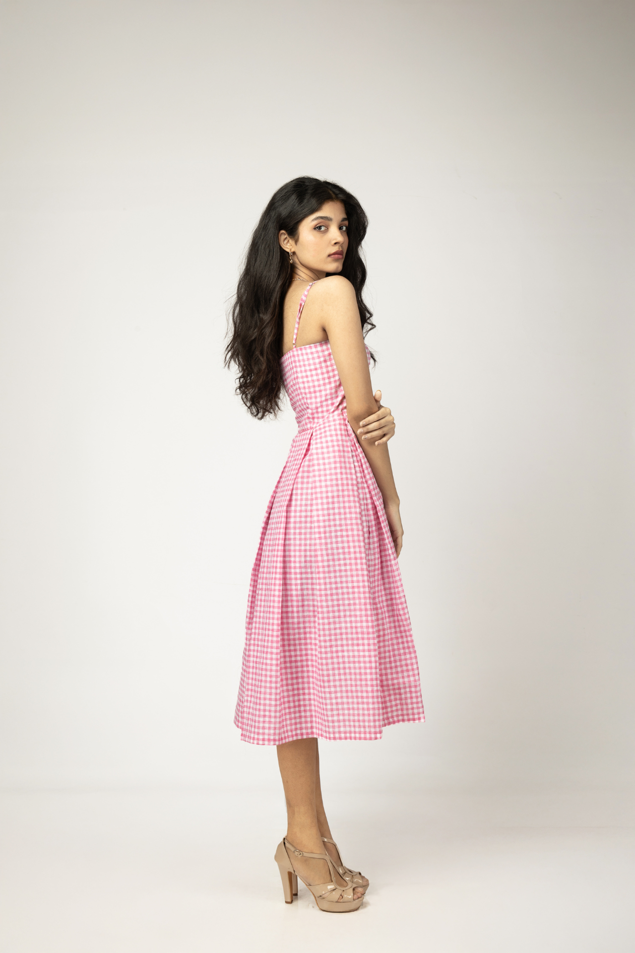 Step into summer with effortless charm in the RIRI Gingham Sundress. Designed for the modern realist, this dress features a soft pink gingham print, a square neckline, and delicate spaghetti straps for a timeless yet playful silhouette. The fitted bodice flows into a pleated midi skirt, complete with hidden side pockets for functionality.v Made from lightweight, breathable fabric, it's perfect for sun-drenched days and breezy evenings.