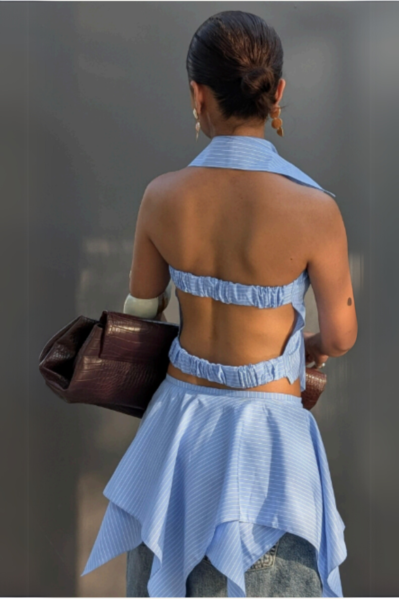 A bold reimagination of classic stripes—this backless halter top with a draped handkerchief hem skirt is made for those who move through life with confidence. Whether styled together or as separates, this set is the perfect mix of structured edge and effortless movement.