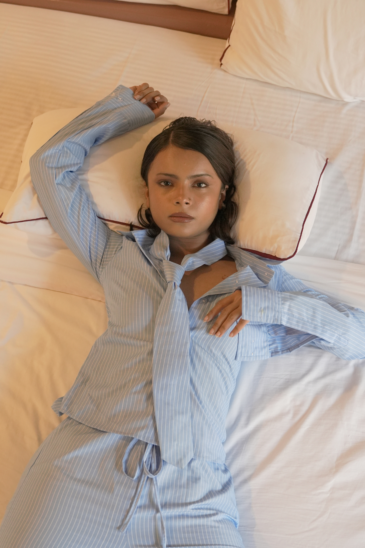 - Pattern: Fine vertical white pinstripes on a pastel blue base
