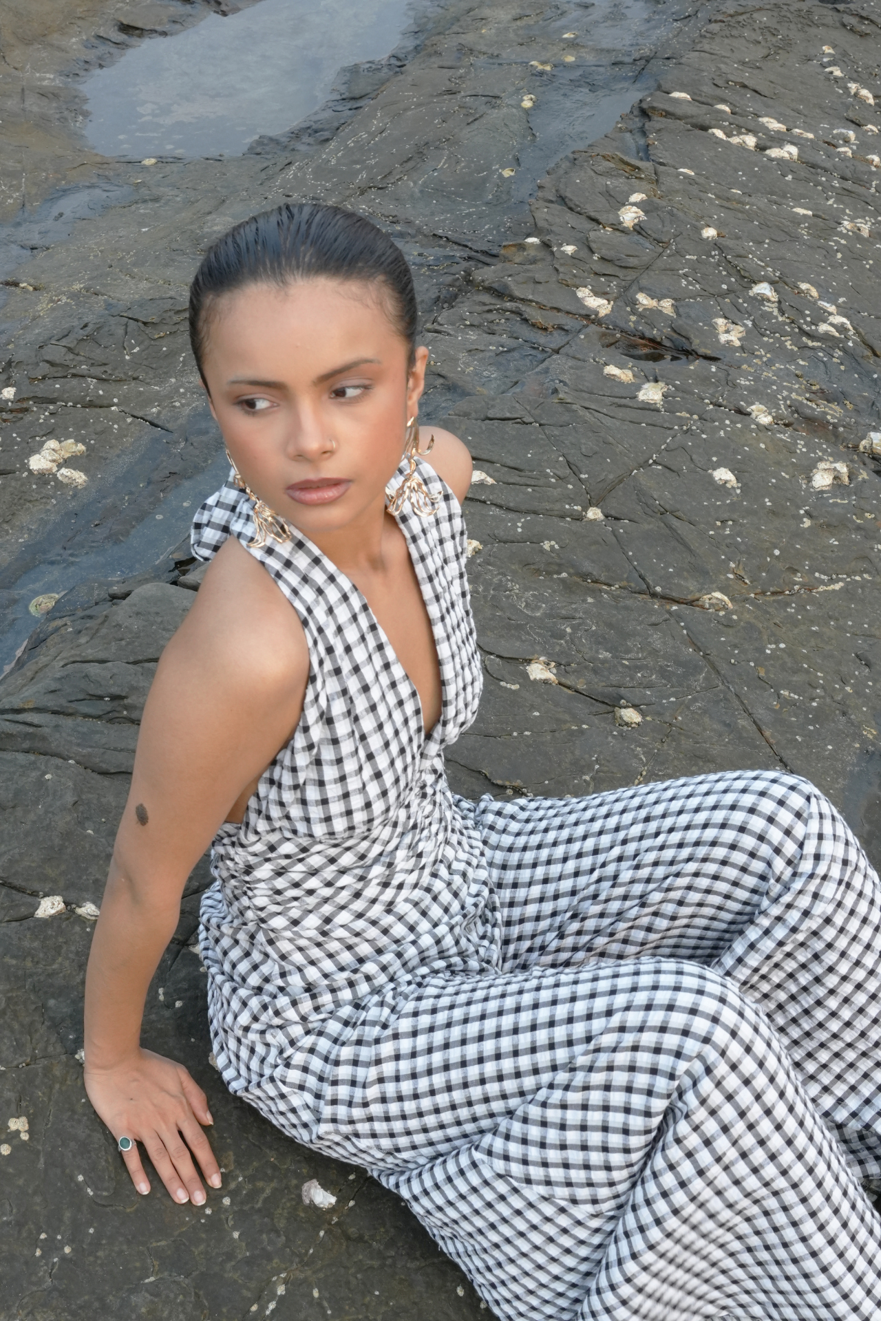 Easy, flowing, and made for movement. This gingham jumpsuit features a deep V-neck, wide-leg silhouette, and a tie-up waist—balancing structure with softness. Whether you’re stepping onto city streets or coastal rocks, it’s designed to move with you.